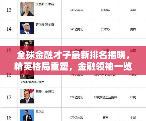 全球金融才子排名最新情况揭示了全球金融精英的崭新格局,华尔街的金融巨头继续引领潮流,欧洲金融新星崭露头角,亚洲金融力量的崛起引起了全球的关注,金融科技领域的创新者也为金融市场注入了新的活力,这些金融才子凭借独特的眼光、深厚的专业知识和敏锐的市场洞察力,推动着全球金融业的发展,在未来,我们期待更多的金融才子涌现出来,为全球金融业的发展贡献更多的力量。